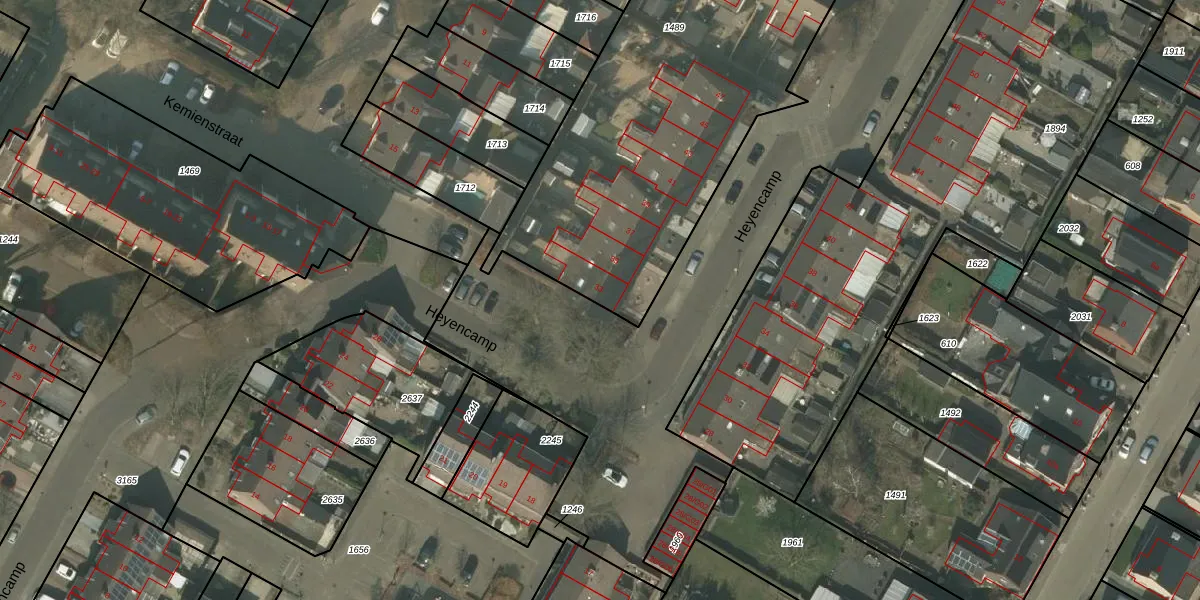 Het perceel waarop Heyencamp 33 staat heeft een oppervlakte van 2163 m². Dit is een zeer groot perceel. De perceeloppervlakte wordt geregistreerd door het Kadaster. Gedetailleerde informatie over de maten van dit perceel kunt u vinden in het rapport Kadastrale kaart met maatvoering van Heyencamp 33.