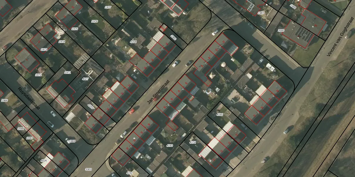 Het perceel waarop Jan Steenstraat 42 staat heeft een oppervlakte van 4445 m². Dit is een zeer groot perceel. De perceeloppervlakte wordt geregistreerd door het Kadaster. Gedetailleerde informatie over de maten van dit perceel kunt u vinden in het rapport Kadastrale kaart met maatvoering van Jan Steenstraat 42.