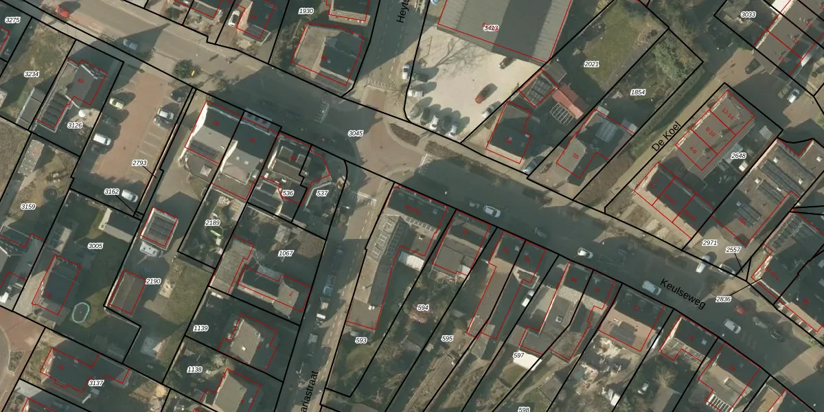 Het perceel waarop Keulseweg 58 staat heeft een oppervlakte van 637 m². Dit is een groot perceel. De perceeloppervlakte wordt geregistreerd door het Kadaster. Gedetailleerde informatie over de maten van dit perceel kunt u vinden in het rapport Kadastrale kaart met maatvoering van Keulseweg 58.