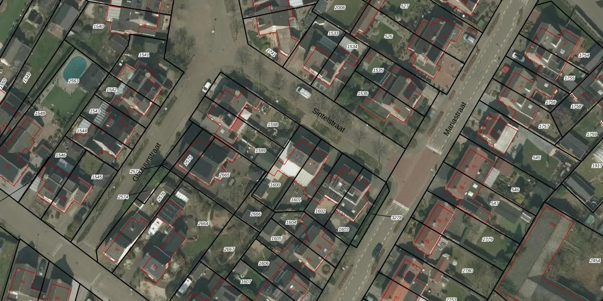 Sintelstraat 1 is gelegen op kadastraal perceel BSL02K1600. Deze kadastrale aanduiding is uniek en wordt gebruikt door het Kadaster om eigendomsrechten en andere zakelijke rechten vast te leggen. Het perceel maakt onderdeel uit van de kadastrale gemeente Beesel.