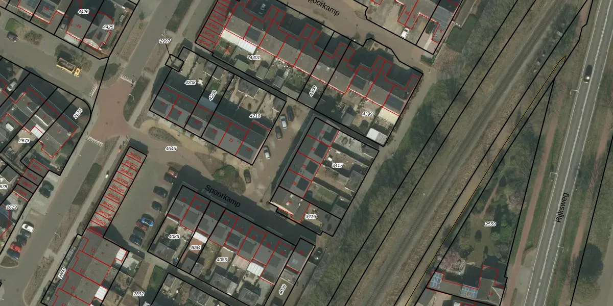 Het perceel waarop Spoorkamp 24 staat heeft een oppervlakte van 594 m². Dit is een groot perceel. De perceeloppervlakte wordt geregistreerd door het Kadaster. Gedetailleerde informatie over de maten van dit perceel kunt u vinden in het rapport Kadastrale kaart met maatvoering van Spoorkamp 24.