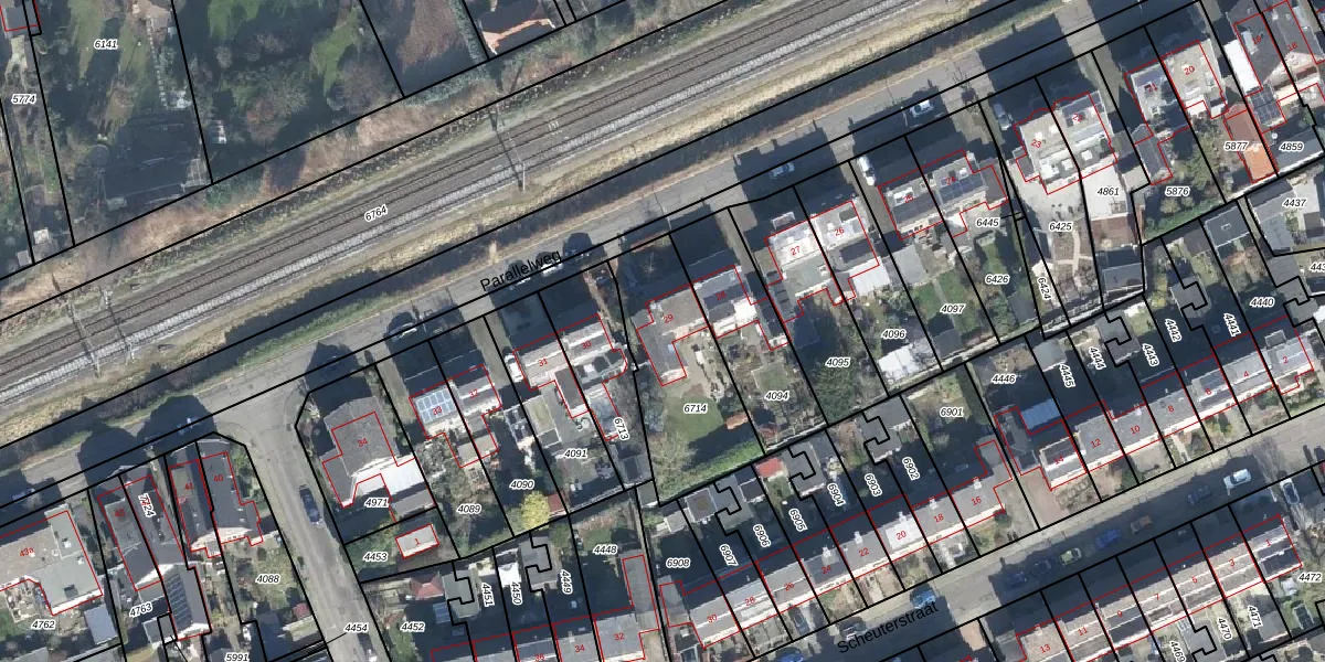 Parallelweg 29 is gelegen op kadastraal perceel RDN02D6714. Deze kadastrale aanduiding is uniek en wordt gebruikt door het Kadaster om eigendomsrechten en andere zakelijke rechten vast te leggen. Het perceel maakt onderdeel uit van de kadastrale gemeente Rheden.