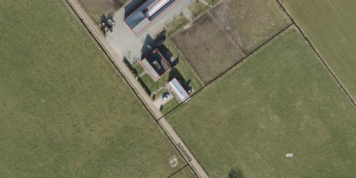 Het perceel waarop Schutsweg 1-i staat heeft een oppervlakte van 1,0 ha. Dit is een zeer groot perceel. De perceeloppervlakte wordt geregistreerd door het Kadaster. Gedetailleerde informatie over de maten van dit perceel kunt u vinden in het rapport Kadastrale kaart met maatvoering van Schutsweg 1-i.