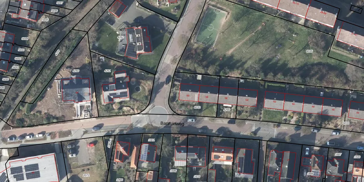 Het perceel waarop Bantuinweg 60 staat heeft een oppervlakte van 600 m². Dit is een groot perceel. De perceeloppervlakte wordt geregistreerd door het Kadaster. Gedetailleerde informatie over de maten van dit perceel kunt u vinden in het rapport Kadastrale kaart met maatvoering van Bantuinweg 60.