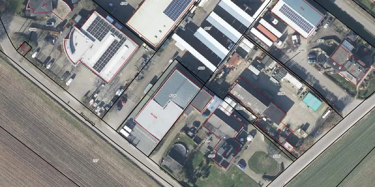 Bergweg 43 is gelegen op kadastraal perceel RNN01G4226. Deze kadastrale aanduiding is uniek en wordt gebruikt door het Kadaster om eigendomsrechten en andere zakelijke rechten vast te leggen. Het perceel maakt onderdeel uit van de kadastrale gemeente Rhenen.