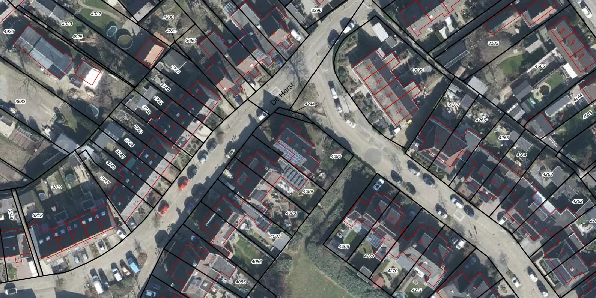 Het perceel waarop De Horst 56 staat heeft een oppervlakte van 439 m². Dit is een groot perceel. De perceeloppervlakte wordt geregistreerd door het Kadaster. Gedetailleerde informatie over de maten van dit perceel kunt u vinden in het rapport Kadastrale kaart met maatvoering van De Horst 56.