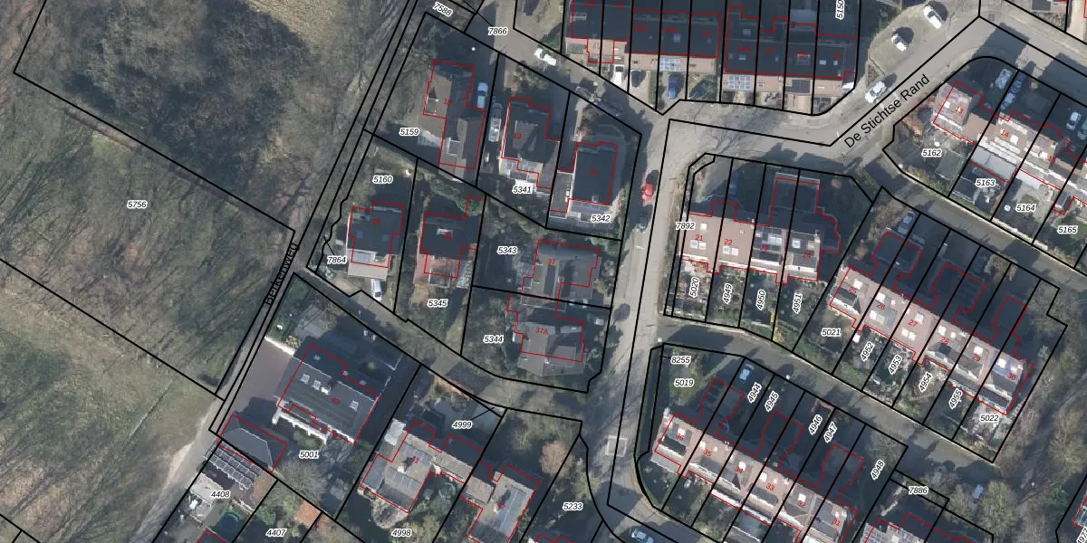 Het perceel waarop De Stichtse Rand 37 staat heeft een oppervlakte van 370 m². Dit is een groot perceel. De perceeloppervlakte wordt geregistreerd door het Kadaster. Gedetailleerde informatie over de maten van dit perceel kunt u vinden in het rapport Kadastrale kaart met maatvoering van De Stichtse Rand 37.