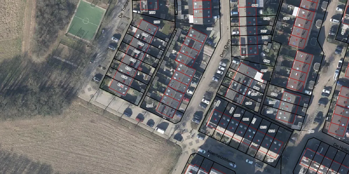 Het perceel waarop Den Oven 7 staat heeft een oppervlakte van 2300 m². Dit is een zeer groot perceel. De perceeloppervlakte wordt geregistreerd door het Kadaster. Gedetailleerde informatie over de maten van dit perceel kunt u vinden in het rapport Kadastrale kaart met maatvoering van Den Oven 7.