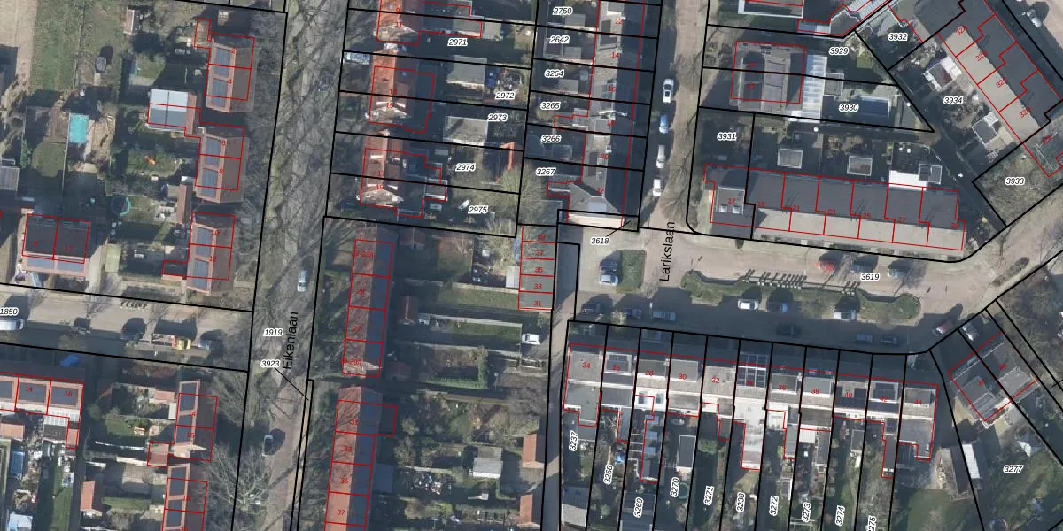Larikslaan 35 is gelegen op kadastraal perceel RNN01G3926. Deze kadastrale aanduiding is uniek en wordt gebruikt door het Kadaster om eigendomsrechten en andere zakelijke rechten vast te leggen. Het perceel maakt onderdeel uit van de kadastrale gemeente Rhenen.