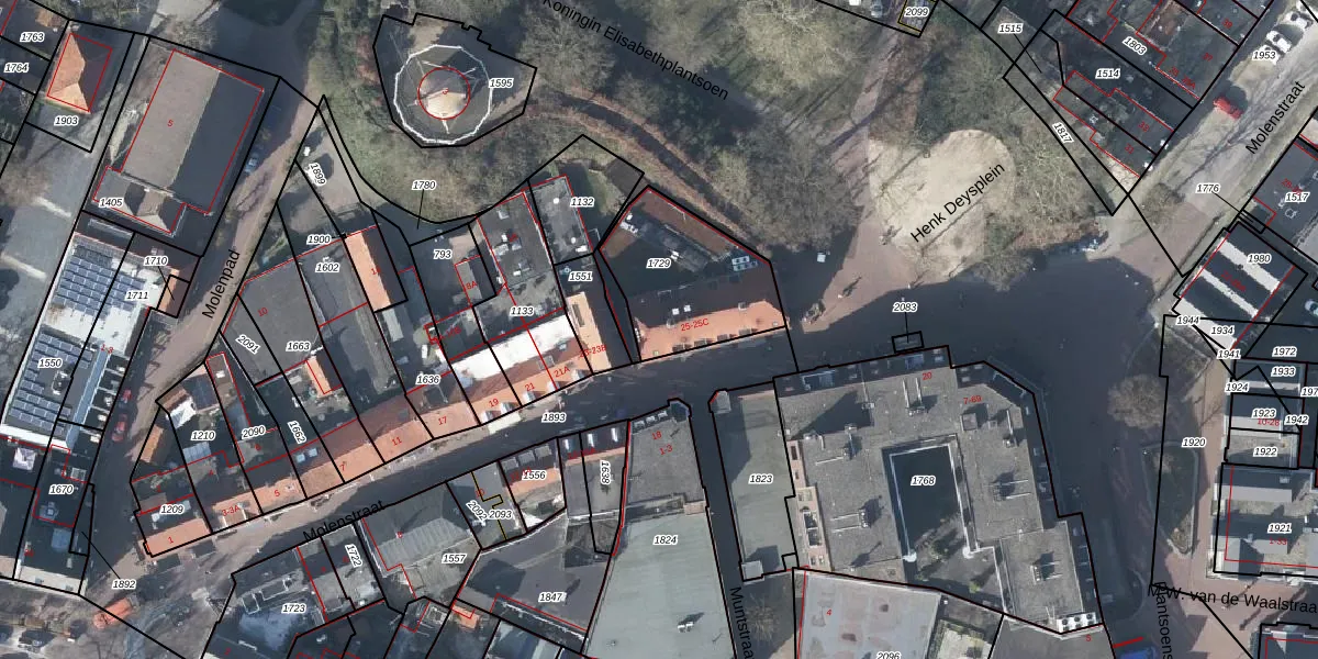 Het perceel waarop Molenstraat 25 staat heeft een oppervlakte van 458 m². Dit is een groot perceel. De perceeloppervlakte wordt geregistreerd door het Kadaster. Gedetailleerde informatie over de maten van dit perceel kunt u vinden in het rapport Kadastrale kaart met maatvoering van Molenstraat 25.