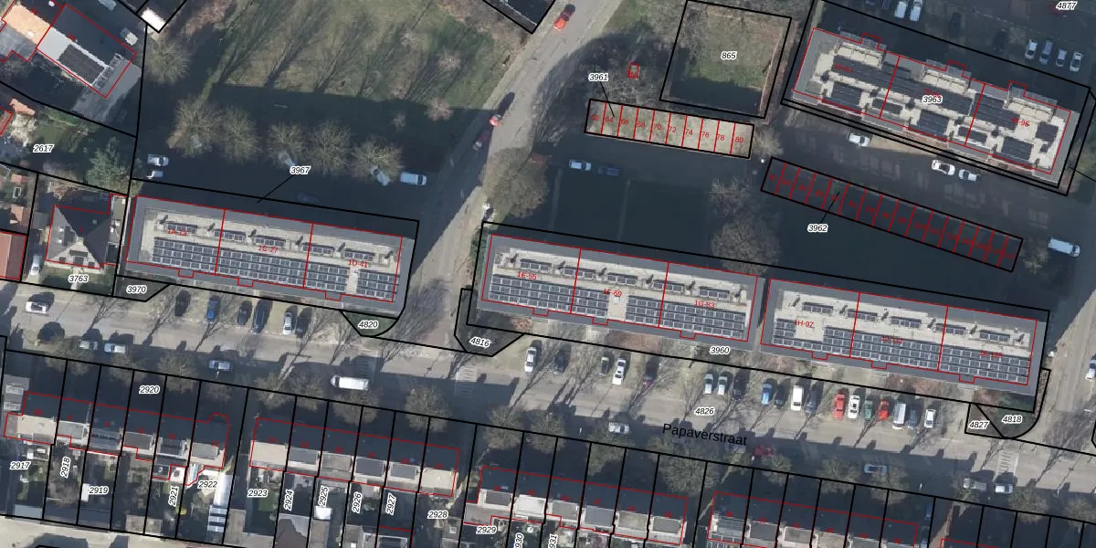 Papaverstraat 53 is gelegen op kadastraal perceel RNN01G3960. Deze kadastrale aanduiding is uniek en wordt gebruikt door het Kadaster om eigendomsrechten en andere zakelijke rechten vast te leggen. Het perceel maakt onderdeel uit van de kadastrale gemeente Rhenen.