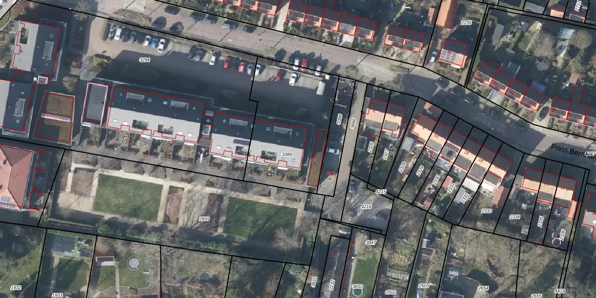 Het perceel waarop Prins Bernhardstraat 2-I staat heeft een oppervlakte van 1065 m². Dit is een zeer groot perceel. De perceeloppervlakte wordt geregistreerd door het Kadaster. Gedetailleerde informatie over de maten van dit perceel kunt u vinden in het rapport Kadastrale kaart met maatvoering van Prins Bernhardstraat 2-I.