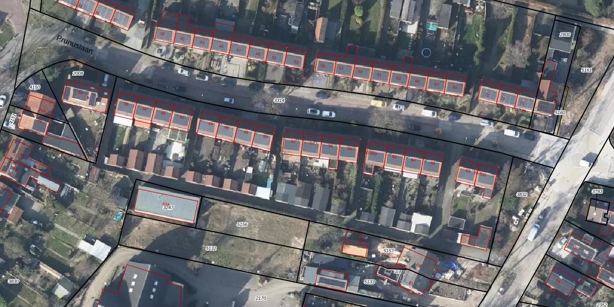 Prunuslaan 54 is gelegen op kadastraal perceel RNN01G3830. Deze kadastrale aanduiding is uniek en wordt gebruikt door het Kadaster om eigendomsrechten en andere zakelijke rechten vast te leggen. Het perceel maakt onderdeel uit van de kadastrale gemeente Rhenen.