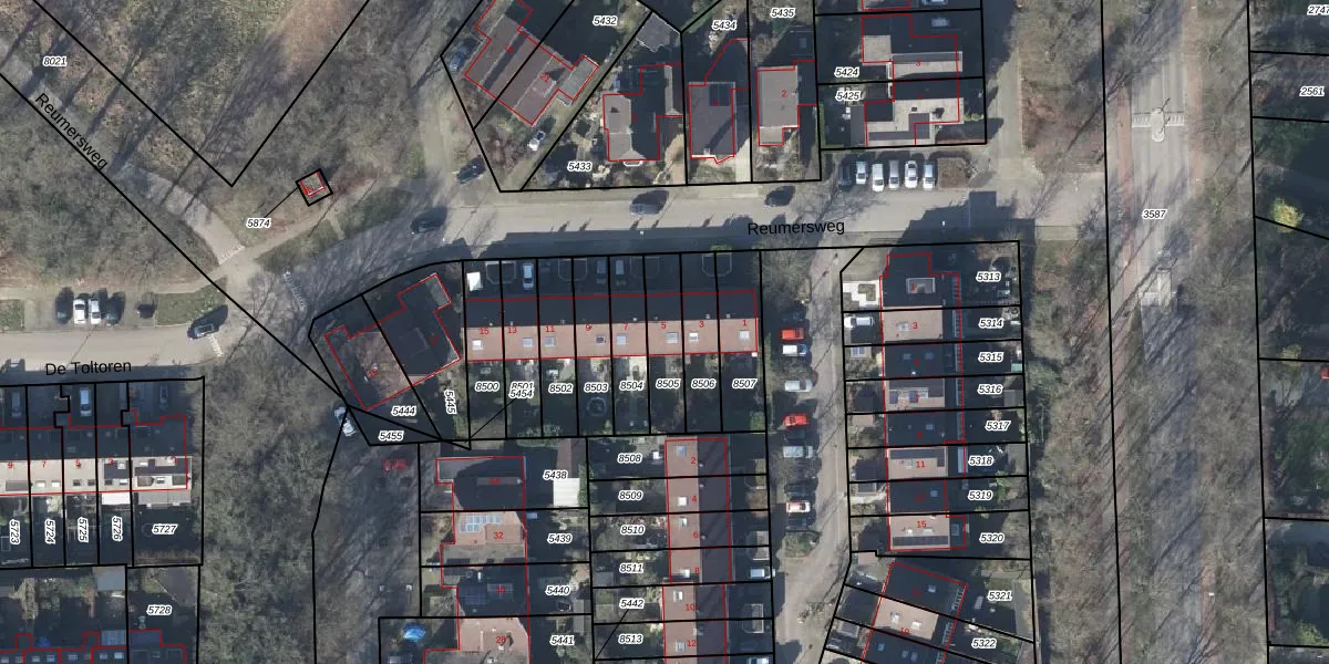 Reumersweg 5 is gelegen op kadastraal perceel RNN01H8505. Deze kadastrale aanduiding is uniek en wordt gebruikt door het Kadaster om eigendomsrechten en andere zakelijke rechten vast te leggen. Het perceel maakt onderdeel uit van de kadastrale gemeente Rhenen.