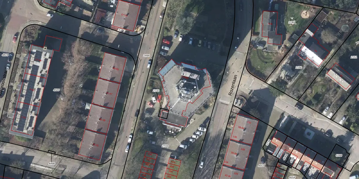 Rozenlaan 53 is gelegen op kadastraal perceel RNN01G2733. Deze kadastrale aanduiding is uniek en wordt gebruikt door het Kadaster om eigendomsrechten en andere zakelijke rechten vast te leggen. Het perceel maakt onderdeel uit van de kadastrale gemeente Rhenen.