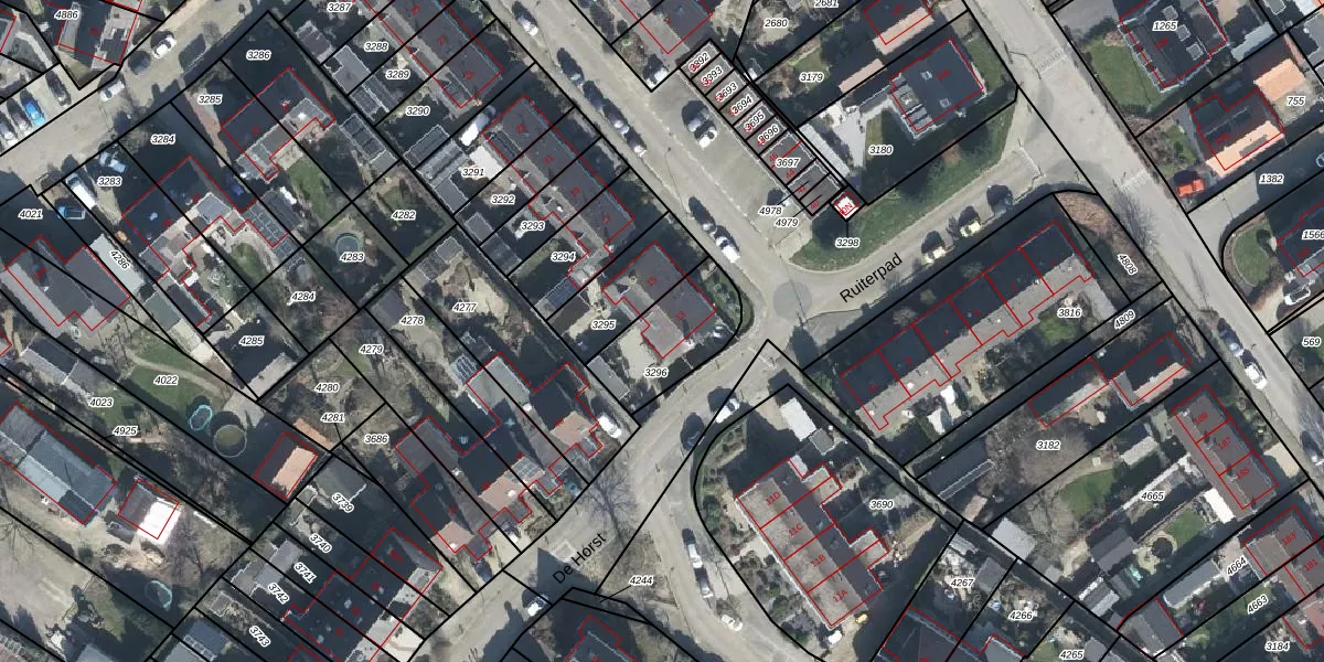 Ruiterpad 13 is gelegen op kadastraal perceel RNN01G3296. Deze kadastrale aanduiding is uniek en wordt gebruikt door het Kadaster om eigendomsrechten en andere zakelijke rechten vast te leggen. Het perceel maakt onderdeel uit van de kadastrale gemeente Rhenen.
