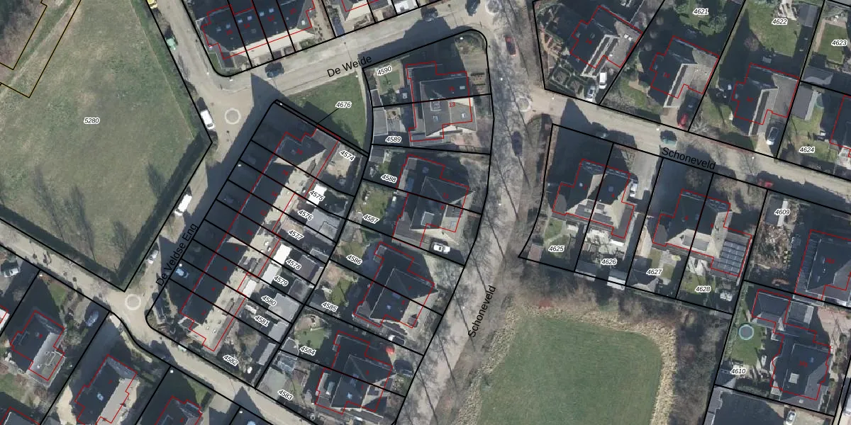 Schoneveld 9 is gelegen op kadastraal perceel RNN01G4587. Deze kadastrale aanduiding is uniek en wordt gebruikt door het Kadaster om eigendomsrechten en andere zakelijke rechten vast te leggen. Het perceel maakt onderdeel uit van de kadastrale gemeente Rhenen.