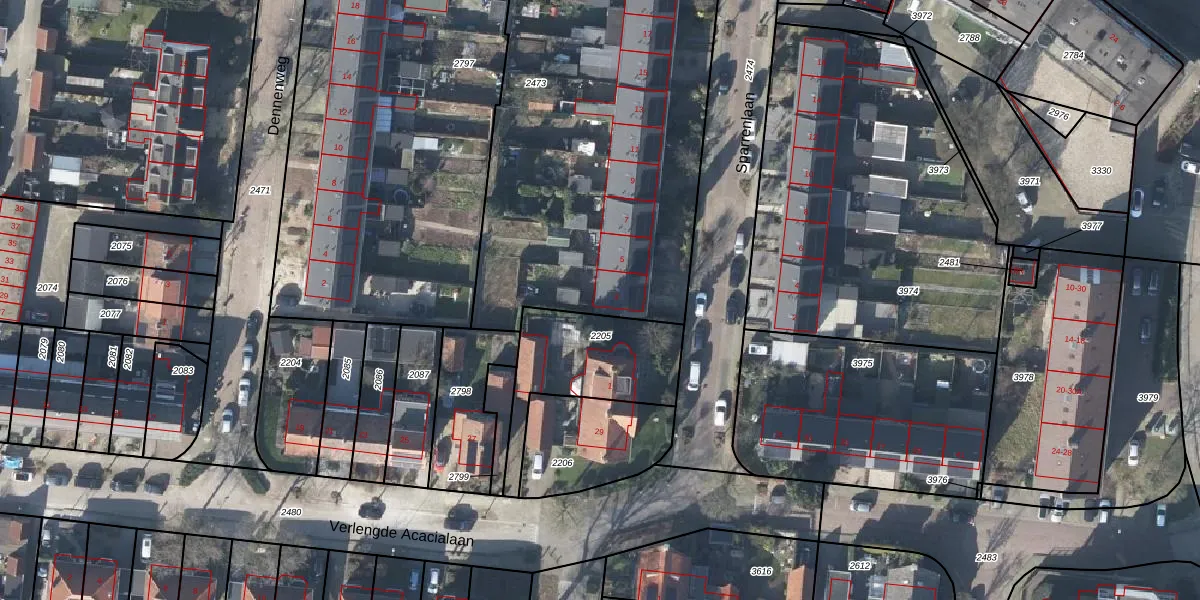 Sparrenlaan 3 is gelegen op kadastraal perceel RNN01G2473. Deze kadastrale aanduiding is uniek en wordt gebruikt door het Kadaster om eigendomsrechten en andere zakelijke rechten vast te leggen. Het perceel maakt onderdeel uit van de kadastrale gemeente Rhenen.