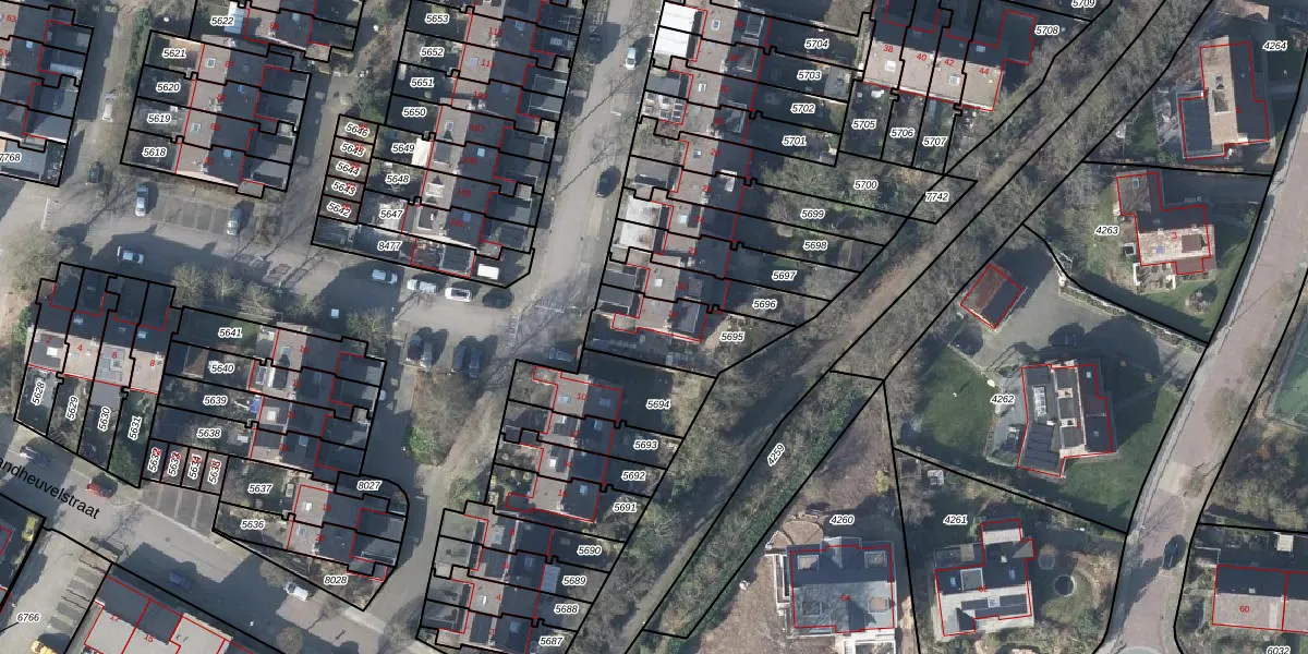 Het perceel waarop het adres ligt is RNN01-H-5695. De afkorting 'RNN01' staat voor kadastrale gemeente Rhenen. De gemiddelde perceelgrootte in Rhenen is 4286,91 m². Dit perceel is kleiner: de perceeloppervlakte bedraagt 262 m². Het grootste perceel in de kadastrale gemeente is 1,05 km². Het kleinste perceel heeft een oppervlakte van 0 m². Er zijn geen andere adressen aanwezig op het perceel. De laatste wijziging in het de Basisregistratie Kadaster (BRK) was op 29-08-2005.