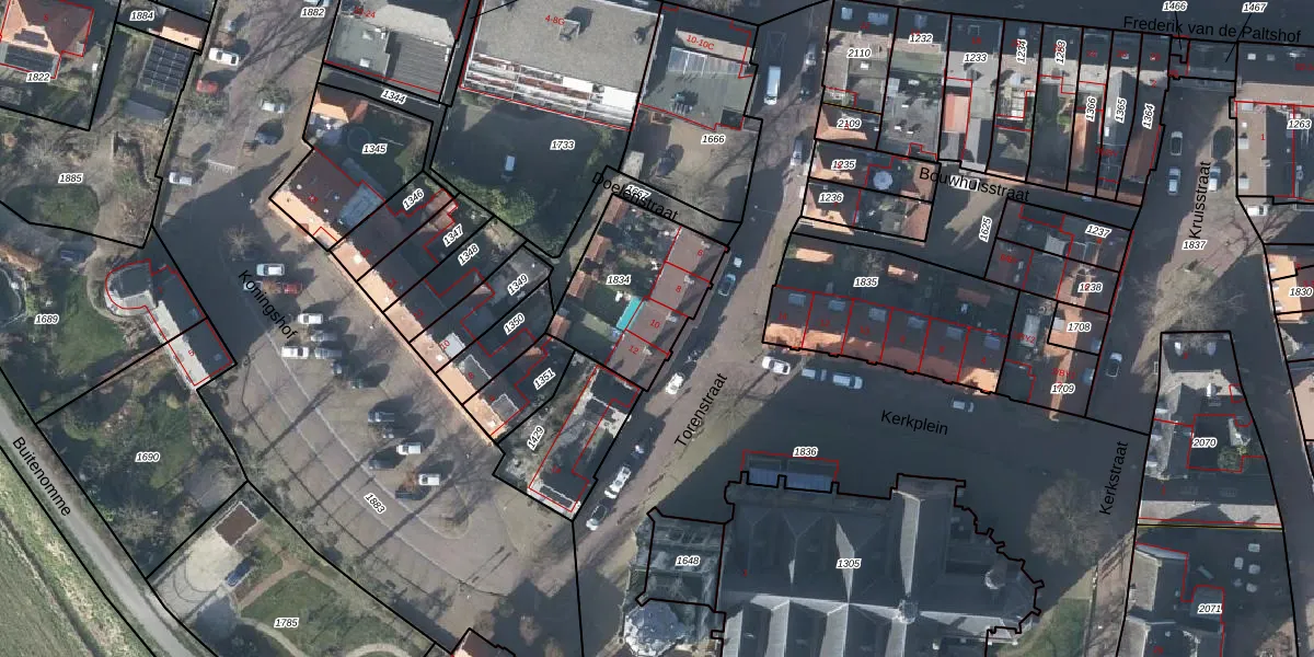 Torenstraat 10 is gelegen op kadastraal perceel RNN01F1834. Deze kadastrale aanduiding is uniek en wordt gebruikt door het Kadaster om eigendomsrechten en andere zakelijke rechten vast te leggen. Het perceel maakt onderdeel uit van de kadastrale gemeente Rhenen.