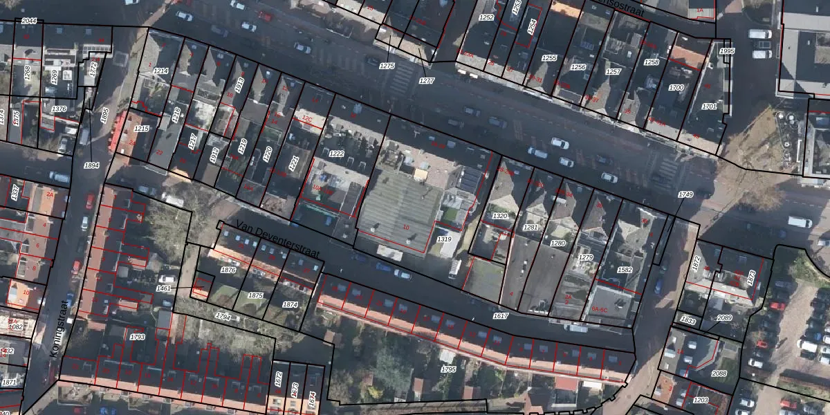 Het perceel waarop Van Deventerstraat 10 staat heeft een oppervlakte van 1043 m². Dit is een zeer groot perceel. De perceeloppervlakte wordt geregistreerd door het Kadaster. Gedetailleerde informatie over de maten van dit perceel kunt u vinden in het rapport Kadastrale kaart met maatvoering van Van Deventerstraat 10.
