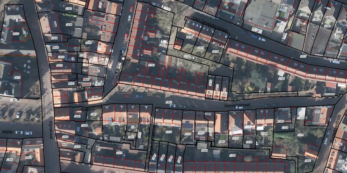 Het perceel waarop Weversstraat 12 staat heeft een oppervlakte van 1604 m². Dit is een zeer groot perceel. De perceeloppervlakte wordt geregistreerd door het Kadaster. Gedetailleerde informatie over de maten van dit perceel kunt u vinden in het rapport Kadastrale kaart met maatvoering van Weversstraat 12.