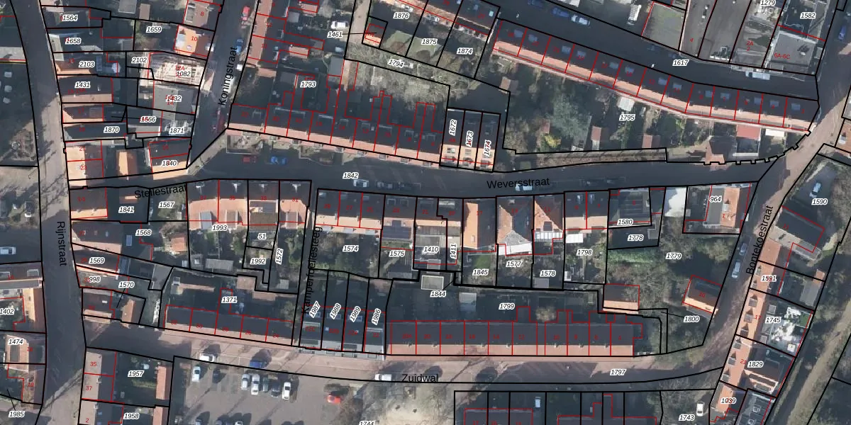 Weversstraat 21 is gelegen op kadastraal perceel RNN01F1410. Deze kadastrale aanduiding is uniek en wordt gebruikt door het Kadaster om eigendomsrechten en andere zakelijke rechten vast te leggen. Het perceel maakt onderdeel uit van de kadastrale gemeente Rhenen.