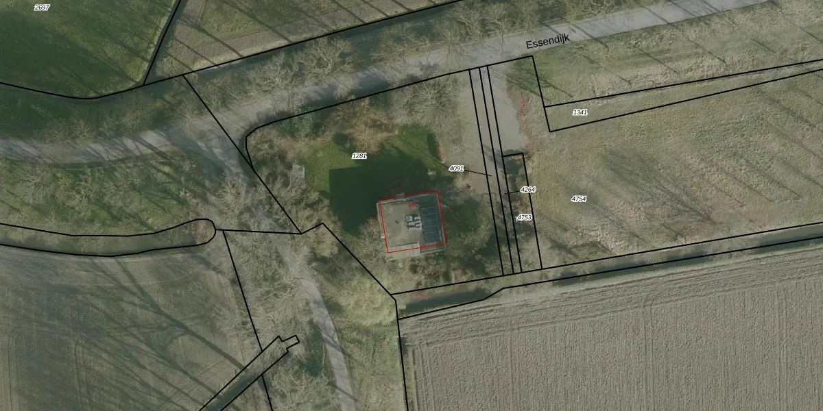 Het perceel waarop Essendijk 44 staat heeft een oppervlakte van 2155 m². Dit is een zeer groot perceel. De perceeloppervlakte wordt geregistreerd door het Kadaster. Gedetailleerde informatie over de maten van dit perceel kunt u vinden in het rapport Kadastrale kaart met maatvoering van Essendijk 44.