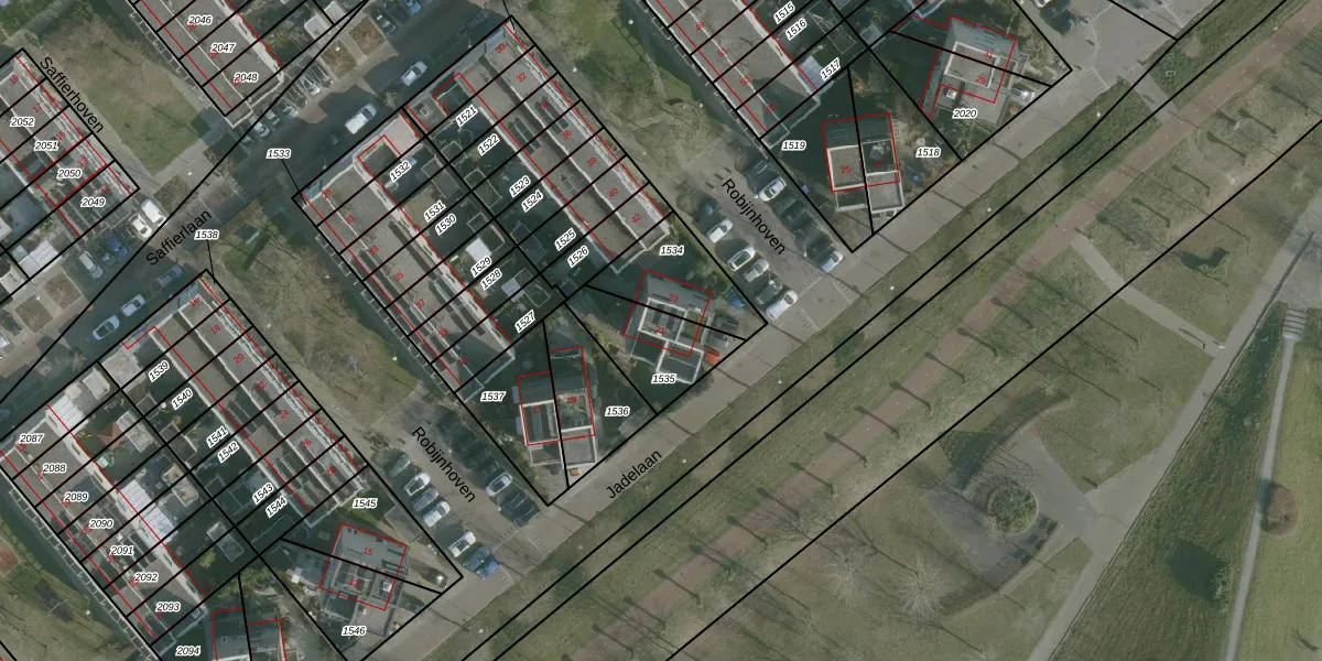 Jadelaan 21 is gelegen op kadastraal perceel RHO00B1535. Deze kadastrale aanduiding is uniek en wordt gebruikt door het Kadaster om eigendomsrechten en andere zakelijke rechten vast te leggen. Het perceel maakt onderdeel uit van de kadastrale gemeente Rhoon.