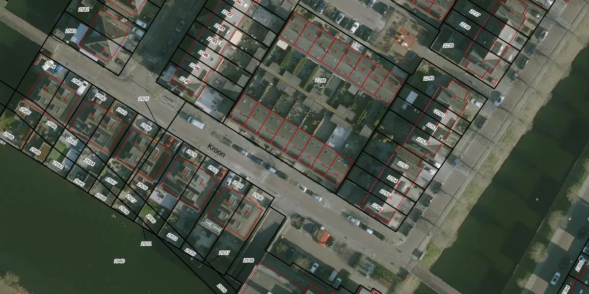 Het perceel waarop Kroon 9 staat heeft een oppervlakte van 2166 m². Dit is een zeer groot perceel. De perceeloppervlakte wordt geregistreerd door het Kadaster. Gedetailleerde informatie over de maten van dit perceel kunt u vinden in het rapport Kadastrale kaart met maatvoering van Kroon 9.