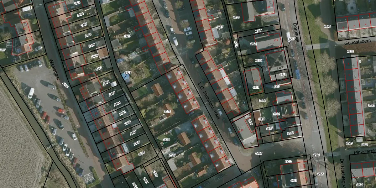 L.G. Molenaarstraat 13 is gelegen op kadastraal perceel RHO00A5612. Deze kadastrale aanduiding is uniek en wordt gebruikt door het Kadaster om eigendomsrechten en andere zakelijke rechten vast te leggen. Het perceel maakt onderdeel uit van de kadastrale gemeente Rhoon.