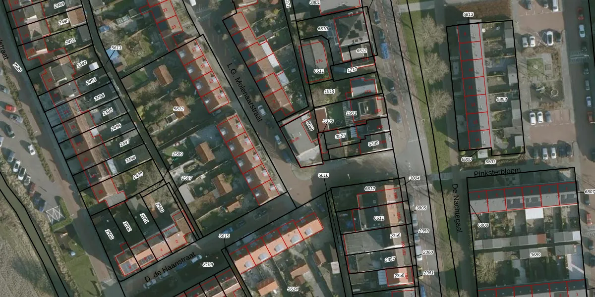 L.G. Molenaarstraat 2-b is gelegen op kadastraal perceel RHO00A6039. Deze kadastrale aanduiding is uniek en wordt gebruikt door het Kadaster om eigendomsrechten en andere zakelijke rechten vast te leggen. Het perceel maakt onderdeel uit van de kadastrale gemeente Rhoon.
