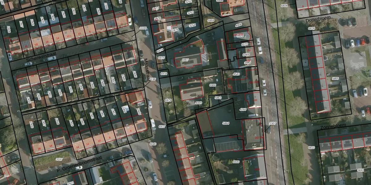 Het perceel waarop Maasstraat 27 staat heeft een oppervlakte van 545 m². Dit is een groot perceel. De perceeloppervlakte wordt geregistreerd door het Kadaster. Gedetailleerde informatie over de maten van dit perceel kunt u vinden in het rapport Kadastrale kaart met maatvoering van Maasstraat 27.