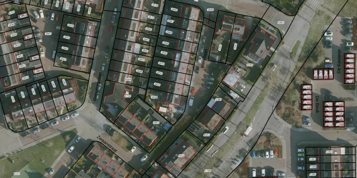 Merellaan 16 is gelegen op kadastraal perceel RHO00A3493. Deze kadastrale aanduiding is uniek en wordt gebruikt door het Kadaster om eigendomsrechten en andere zakelijke rechten vast te leggen. Het perceel maakt onderdeel uit van de kadastrale gemeente Rhoon.