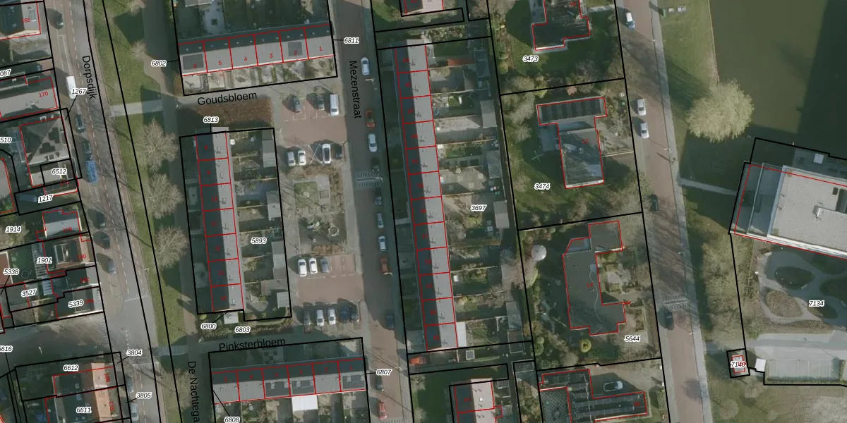 Het perceel waarop Mezenstraat 55 staat heeft een oppervlakte van 2057 m². Dit is een zeer groot perceel. De perceeloppervlakte wordt geregistreerd door het Kadaster. Gedetailleerde informatie over de maten van dit perceel kunt u vinden in het rapport Kadastrale kaart met maatvoering van Mezenstraat 55.