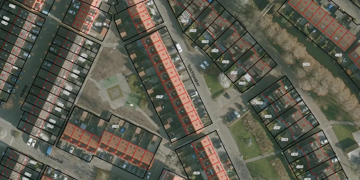 Nachtwaker 45 is gelegen op kadastraal perceel RHO00A5147. Deze kadastrale aanduiding is uniek en wordt gebruikt door het Kadaster om eigendomsrechten en andere zakelijke rechten vast te leggen. Het perceel maakt onderdeel uit van de kadastrale gemeente Rhoon.