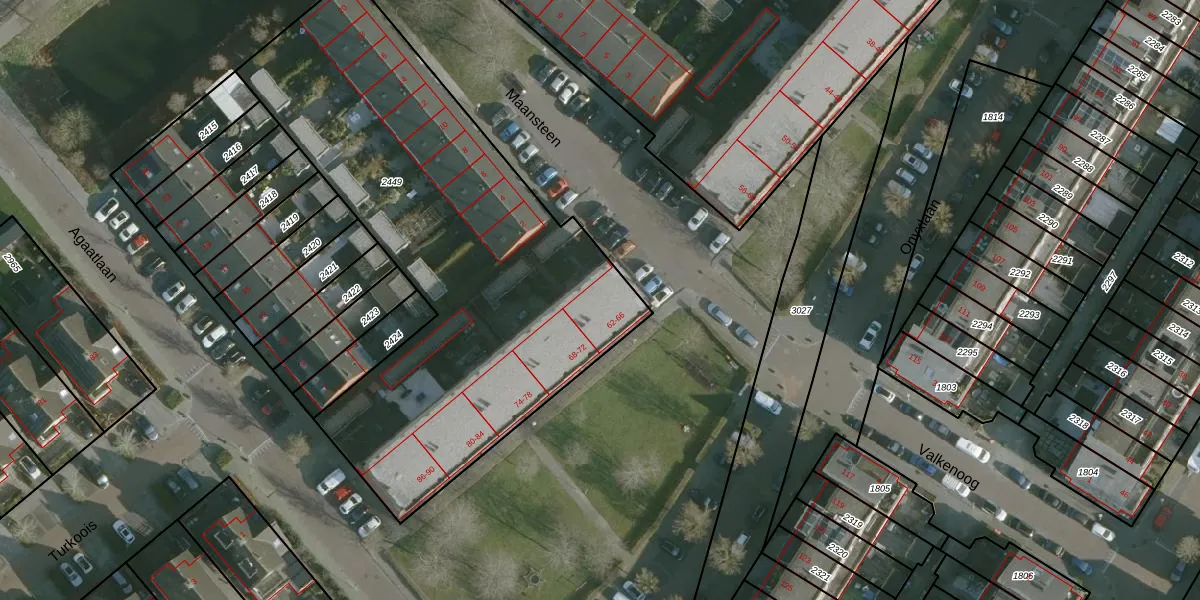 Onyxlaan 64 is gelegen op kadastraal perceel RHO00B2449. Deze kadastrale aanduiding is uniek en wordt gebruikt door het Kadaster om eigendomsrechten en andere zakelijke rechten vast te leggen. Het perceel maakt onderdeel uit van de kadastrale gemeente Rhoon.