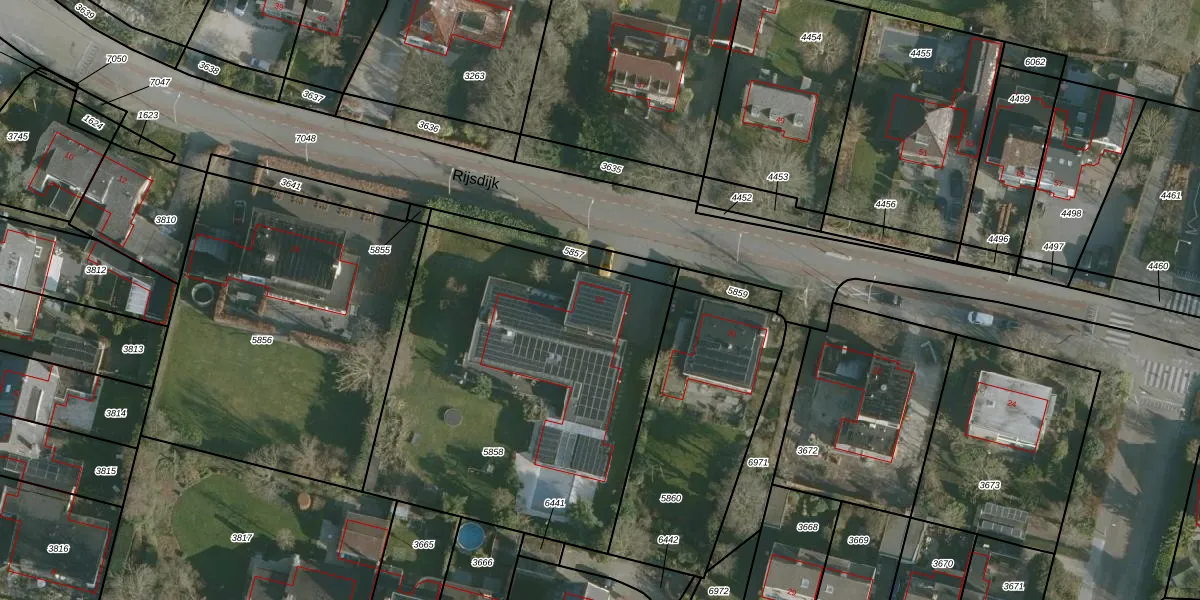Het perceel waarop Rijsdijk 18 staat heeft een oppervlakte van 1960 m². Dit is een zeer groot perceel. De perceeloppervlakte wordt geregistreerd door het Kadaster. Gedetailleerde informatie over de maten van dit perceel kunt u vinden in het rapport Kadastrale kaart met maatvoering van Rijsdijk 18.