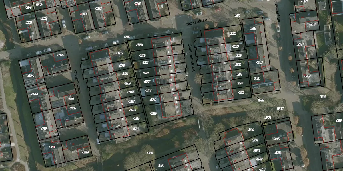 Schubertstraat 12 is gelegen op kadastraal perceel RHO00A4708. Deze kadastrale aanduiding is uniek en wordt gebruikt door het Kadaster om eigendomsrechten en andere zakelijke rechten vast te leggen. Het perceel maakt onderdeel uit van de kadastrale gemeente Rhoon.
