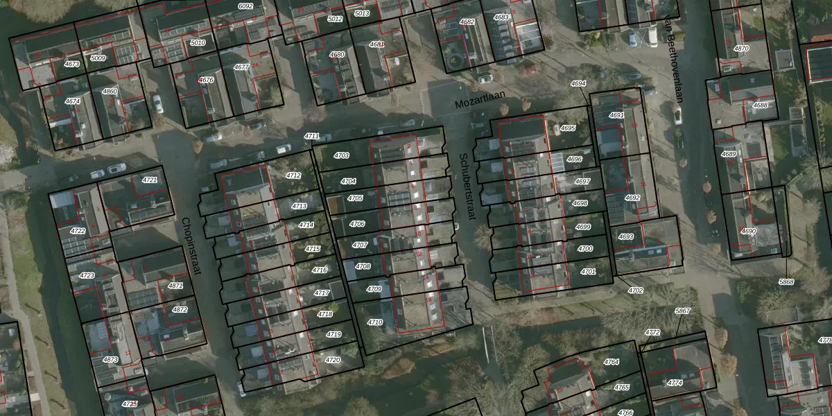 Het perceel waarop Schubertstraat 8 staat heeft een oppervlakte van 159 m². Dit is een middelgroot perceel. De perceeloppervlakte wordt geregistreerd door het Kadaster. Gedetailleerde informatie over de maten van dit perceel kunt u vinden in het rapport Kadastrale kaart met maatvoering van Schubertstraat 8.