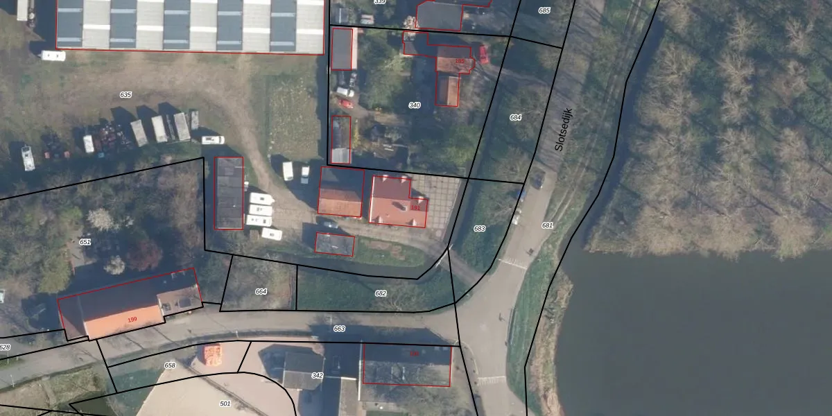Het perceel waarop Slotsedijk 191 staat heeft een oppervlakte van 7323 m². Dit is een zeer groot perceel. De perceeloppervlakte wordt geregistreerd door het Kadaster. Gedetailleerde informatie over de maten van dit perceel kunt u vinden in het rapport Kadastrale kaart met maatvoering van Slotsedijk 191.