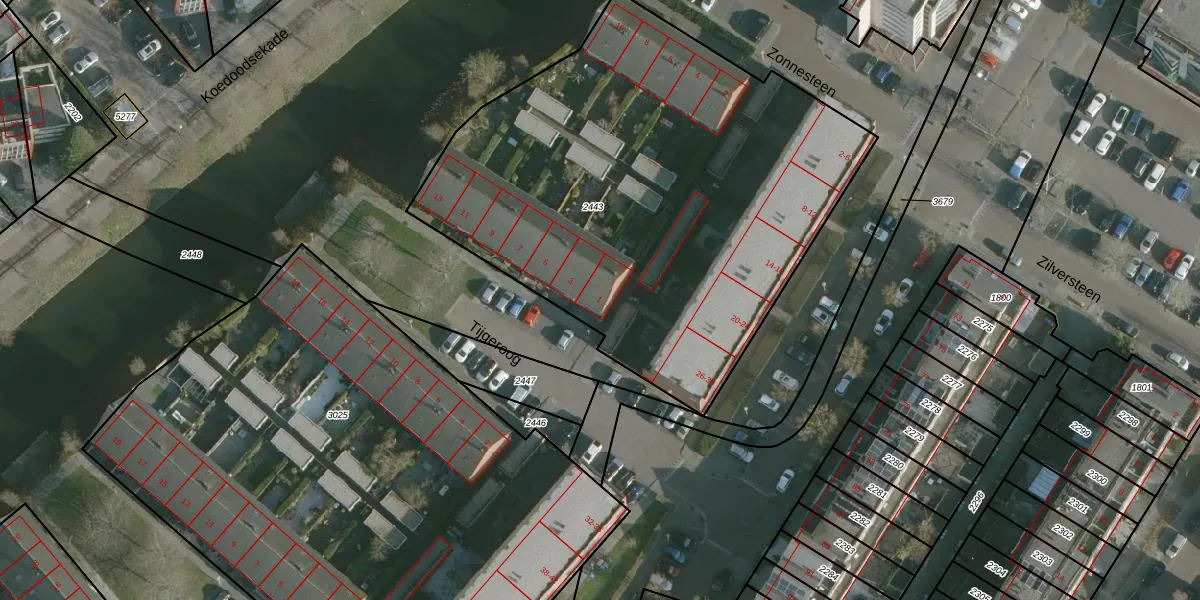 Tijgeroog 1 is gelegen op kadastraal perceel RHO00B2443. Deze kadastrale aanduiding is uniek en wordt gebruikt door het Kadaster om eigendomsrechten en andere zakelijke rechten vast te leggen. Het perceel maakt onderdeel uit van de kadastrale gemeente Rhoon.