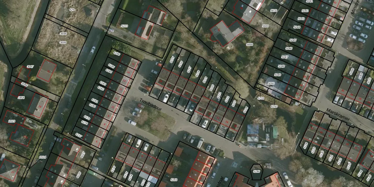Het perceel waarop Troubadour 19 staat heeft een oppervlakte van 154 m². Dit is een middelgroot perceel. De perceeloppervlakte wordt geregistreerd door het Kadaster. Gedetailleerde informatie over de maten van dit perceel kunt u vinden in het rapport Kadastrale kaart met maatvoering van Troubadour 19.