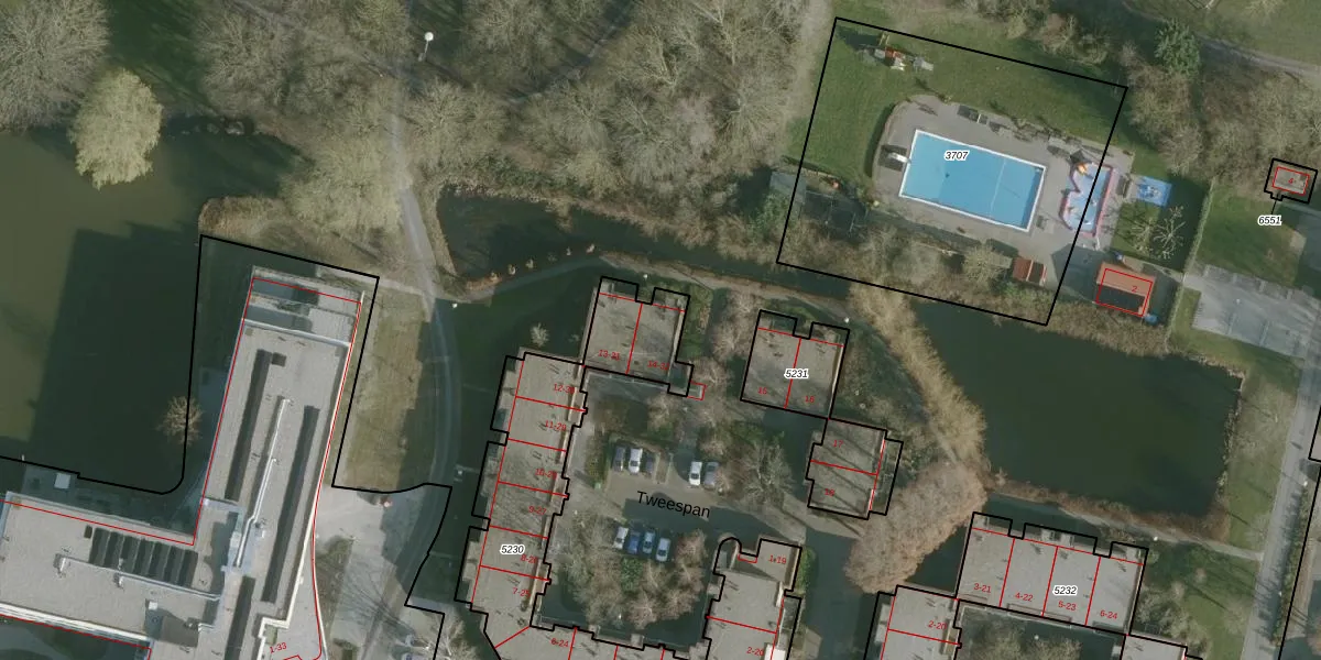 Het perceel waarop Tweespan 32 staat heeft een oppervlakte van 1297 m². Dit is een zeer groot perceel. De perceeloppervlakte wordt geregistreerd door het Kadaster. Gedetailleerde informatie over de maten van dit perceel kunt u vinden in het rapport Kadastrale kaart met maatvoering van Tweespan 32.