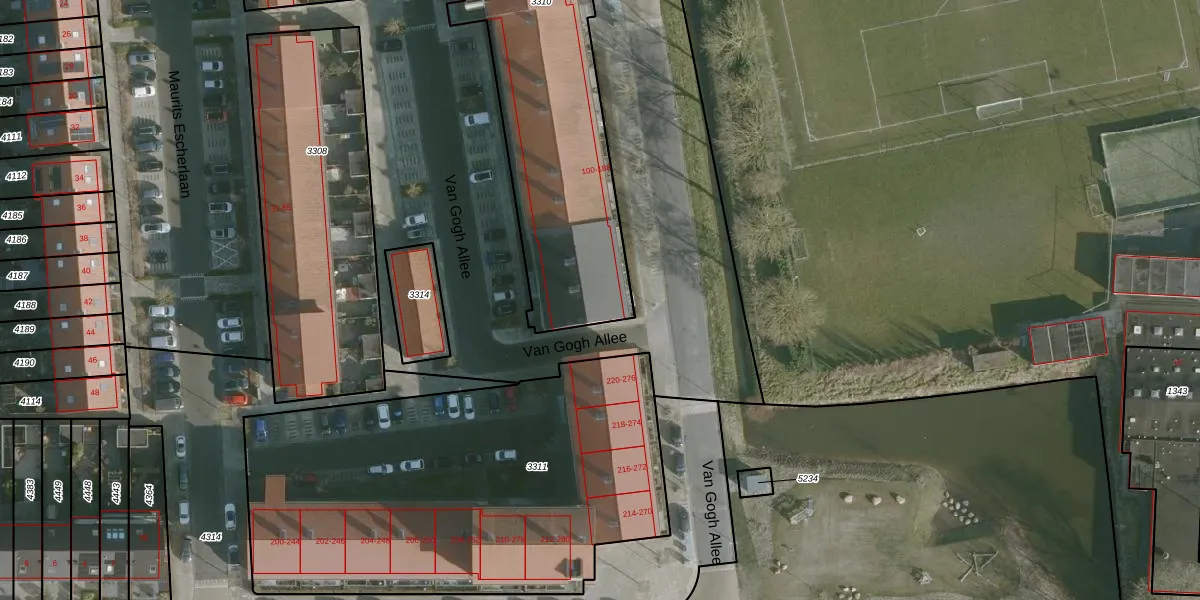 Van Gogh Allee 100 is gelegen op kadastraal perceel RHO00B3310. Deze kadastrale aanduiding is uniek en wordt gebruikt door het Kadaster om eigendomsrechten en andere zakelijke rechten vast te leggen. Het perceel maakt onderdeel uit van de kadastrale gemeente Rhoon.