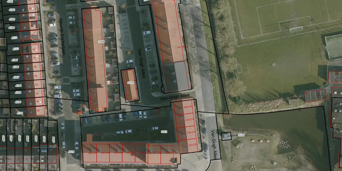 Van Gogh Allee 156 is gelegen op kadastraal perceel RHO00B3310. Deze kadastrale aanduiding is uniek en wordt gebruikt door het Kadaster om eigendomsrechten en andere zakelijke rechten vast te leggen. Het perceel maakt onderdeel uit van de kadastrale gemeente Rhoon.