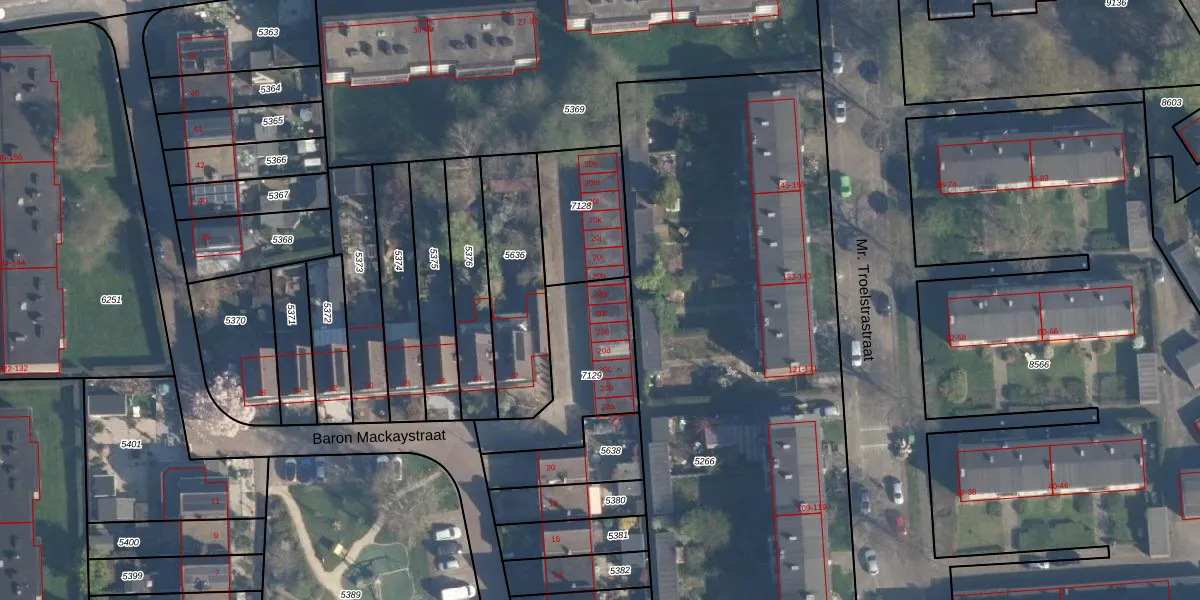 Het perceel waarop Baron Mackaystraat 20-g staat heeft een oppervlakte van 415 m². Dit is een groot perceel. De perceeloppervlakte wordt geregistreerd door het Kadaster. Gedetailleerde informatie over de maten van dit perceel kunt u vinden in het rapport Kadastrale kaart met maatvoering van Baron Mackaystraat 20-g.