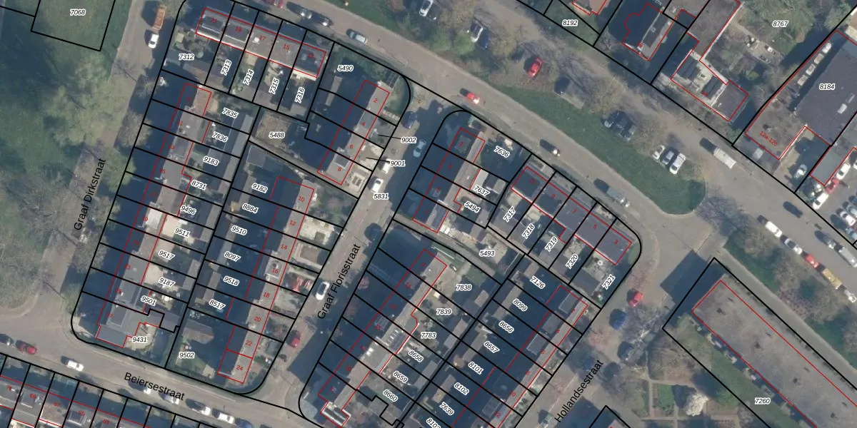 Het perceel waarop Graaf Florisstraat 7 staat heeft een oppervlakte van 255 m². Dit is een middelgroot perceel. De perceeloppervlakte wordt geregistreerd door het Kadaster. Gedetailleerde informatie over de maten van dit perceel kunt u vinden in het rapport Kadastrale kaart met maatvoering van Graaf Florisstraat 7.