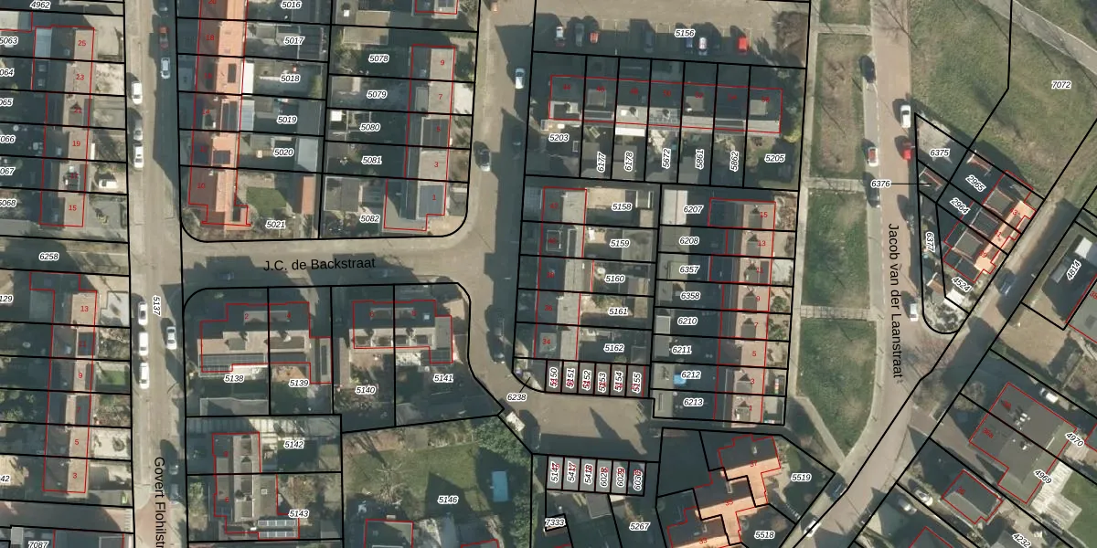 Het perceel waarop J.C. de Backstraat 38 staat heeft een oppervlakte van 153 m². Dit is een middelgroot perceel. De perceeloppervlakte wordt geregistreerd door het Kadaster. Gedetailleerde informatie over de maten van dit perceel kunt u vinden in het rapport Kadastrale kaart met maatvoering van J.C. de Backstraat 38.