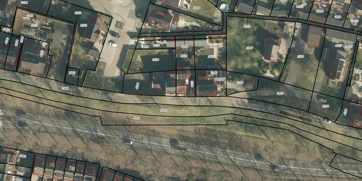 Middenmolendijk 181 is gelegen op kadastraal perceel RDK01H7239. Deze kadastrale aanduiding is uniek en wordt gebruikt door het Kadaster om eigendomsrechten en andere zakelijke rechten vast te leggen. Het perceel maakt onderdeel uit van de kadastrale gemeente Ridderkerk.